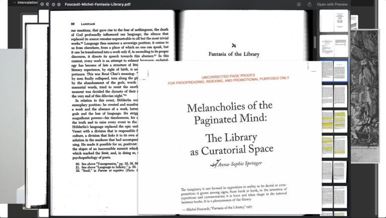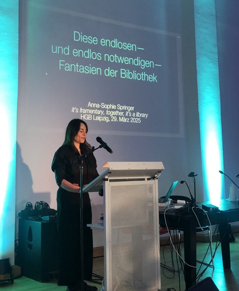 On 29 March 2025, I presented a performative reading titled “These Endless—and Endlessly Necessary—Fantasies of the Library” as part of this year’s “It’s a Book” symposium at the Academy of Fine Arts (HGB) in Leipzig. The event marked the tenth anniversary of “Fantasies of the Library,” the first volume in the “intercalations: paginated exhibitions” series I co-edit, and offered an opportunity to publicly revisit this work—an invitation extended by Sabine Schmid and Prof. Marcus Dressen, who highlighted their own generative engagement with my visual essay “Reading Rooms Reading Machines.”
